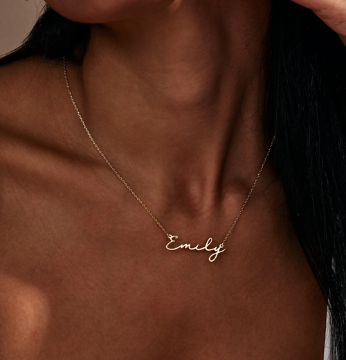 A dainty minimalist name necklace designed with clean lettering and a refined silhouette. Simple and lightweight, it adds a subtle personalized touch to everyday styling.